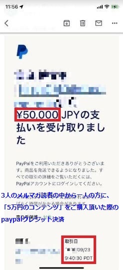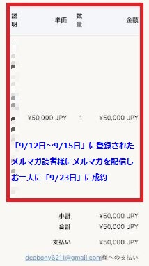 また、ブログ経由の集客で「たったの3人のメルマガ読者」の中から一人の方に、5万円のコンテンツの成約を頂くことが出来ました。